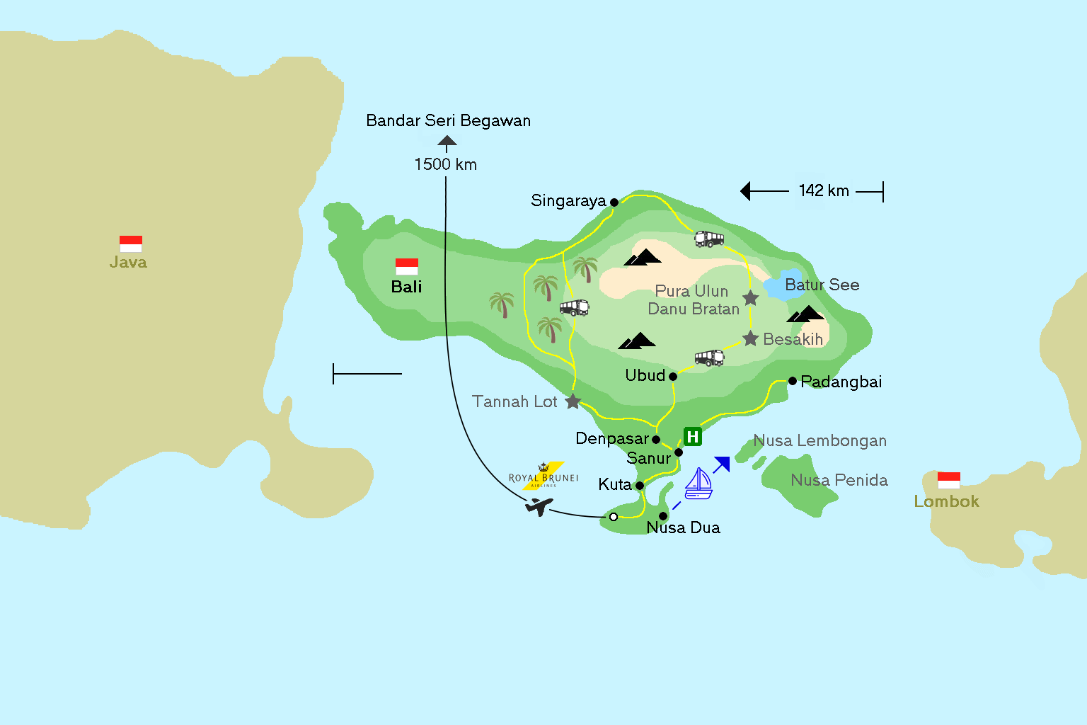 Flug mit Royal Brunei von Frankfurt nach Denpassar auf Bali über Bangkok und Brunei. Vom Flughafen Ngurah Rai bei Denpasar fahren wir am späten Nachmittag nach Sanur ins