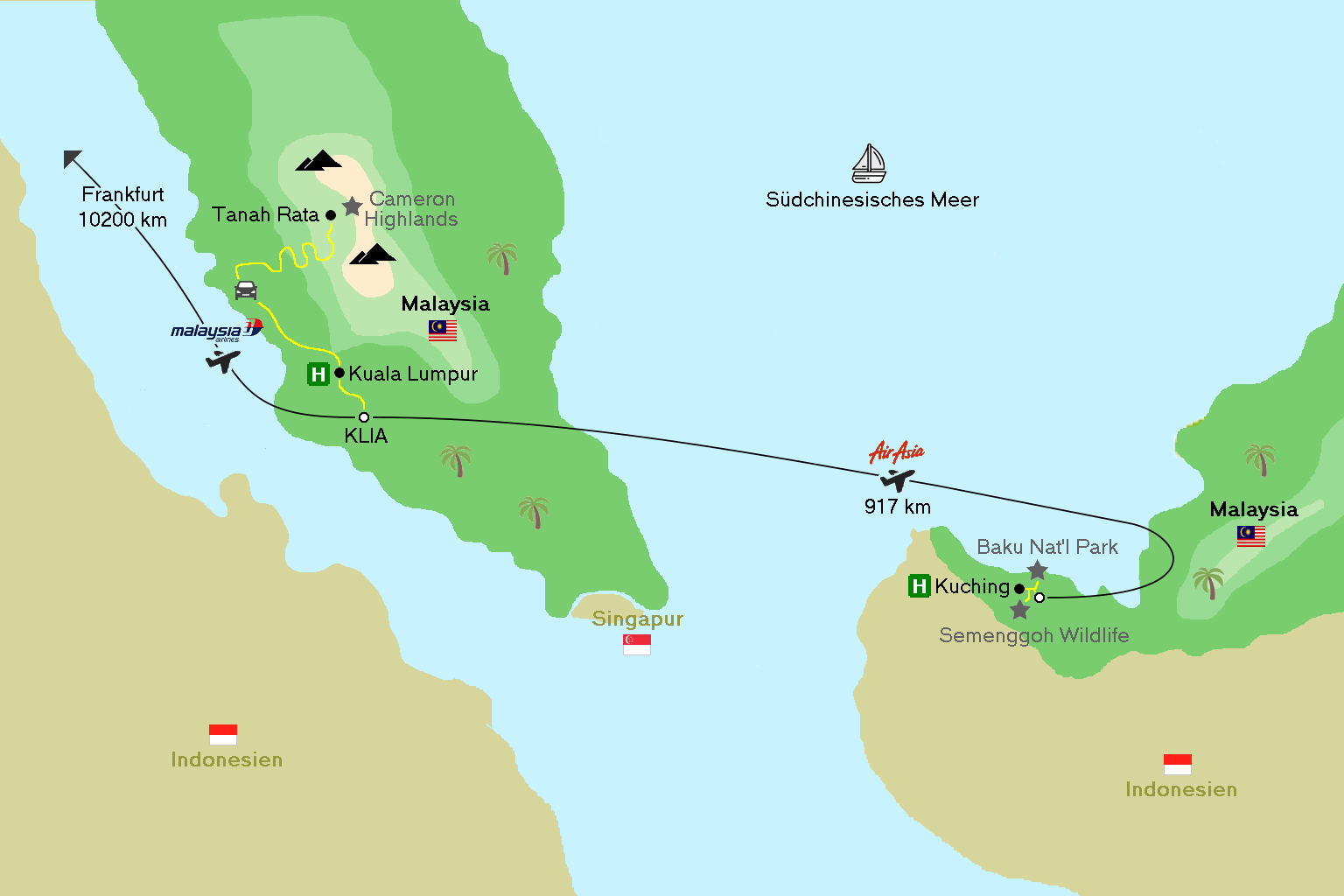 Flug mit Malaysia Airlines nach Kuala Lumpur, weiter mit Air Asia nach Kuching