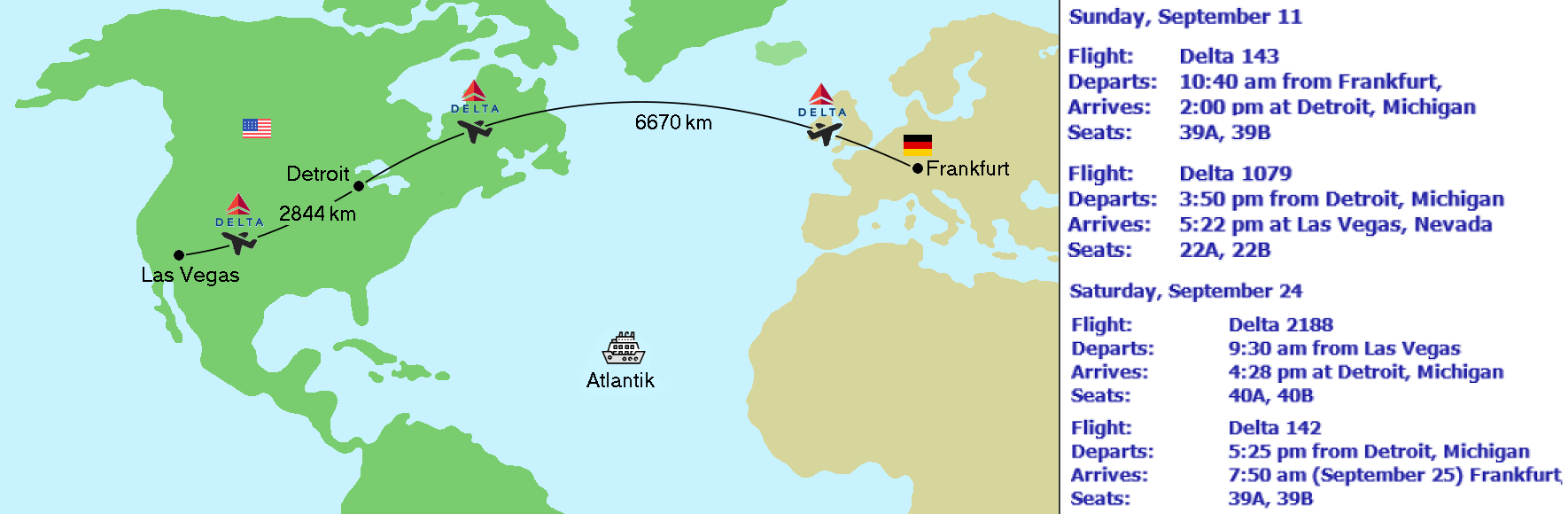 Am Sonntag den 11.09.2011 fliegen wir von Frankfurt über Detroit ins Spielerparadies Las Vegas. Dort verbringen wir den ersten Tag und starten danach zu unserer Rundreise, die uns durch die US-Staaten Nevada, Arizona, Utah, Colorado und Kalifornien führt.