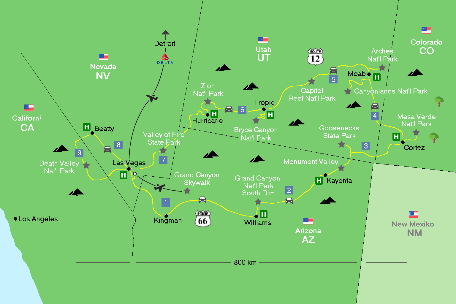 | | | Cortez - Moab (Arches, Canyonlands) | | 184 km | |