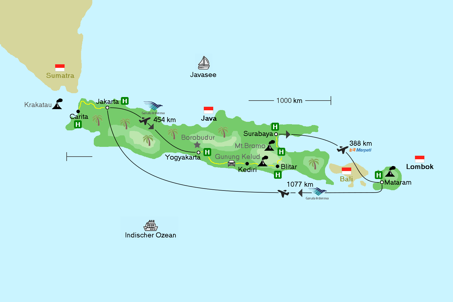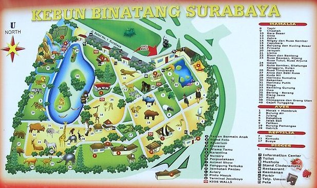 Übernachtung im Hotel Yoschi's (katastrophal dreckig !) direkt unterhalb des Mt. Bromo. Am nächsten Tag fahren wir nachmittags weiter nach Surabaya und besuchen dort den zoologischen Garten, der als einziger Zoo auf der Welt Komodo Warane beherbergt.