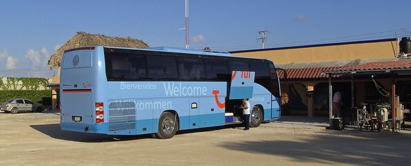 Fahrt mit dem Bus nach Cancun. Überfahrt mit einem Katamaran zur Isla Mujeres.
